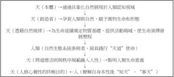 如姚新中提到,人與自然之間的關係,通過「生」緊密相連。16而劉怡也提到,從自然觀上講,「天人合一」的本質就是强調人與自然和諧共生、協調發展。人與自然是一個不可分割的整體,天地、人、萬物相互聯繫、相互依存。在這個統一的整體中,一切生命都積極參與到有機整體的大化流行之中,人類與天地自然、生命萬物息息相關、幷行不悖、幷育不害。17由此,我們清晰地認知到,人、天地自然和萬物生息之間相互依存,缺一不可。《禮記·禮運》篇中所言:「人者,天地之心也。」張載强調人「爲天地立心」,18這些論述都有力地凸顯了人的重要性。